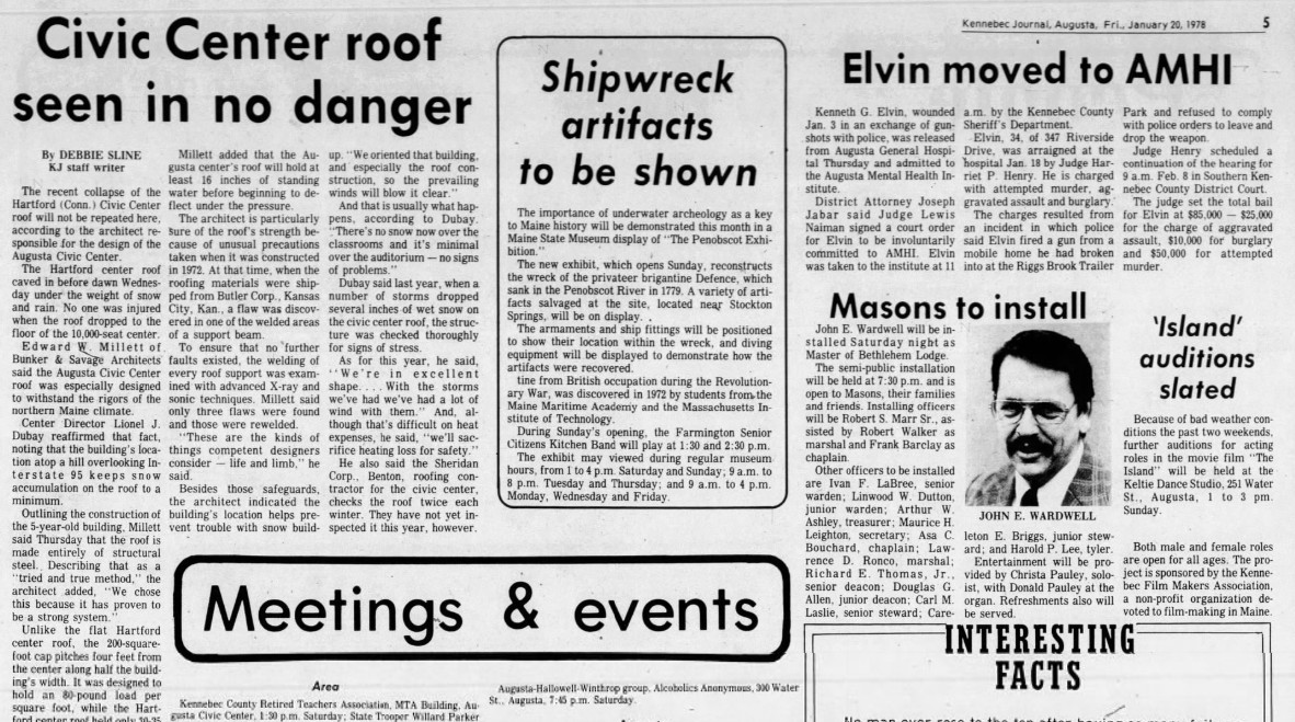 Jan. 20, 1978: Roof of Augusta Civic Center not in any danger of collapsing says architects, and shipwreck artifacts to be shown this month at Maine State Museum