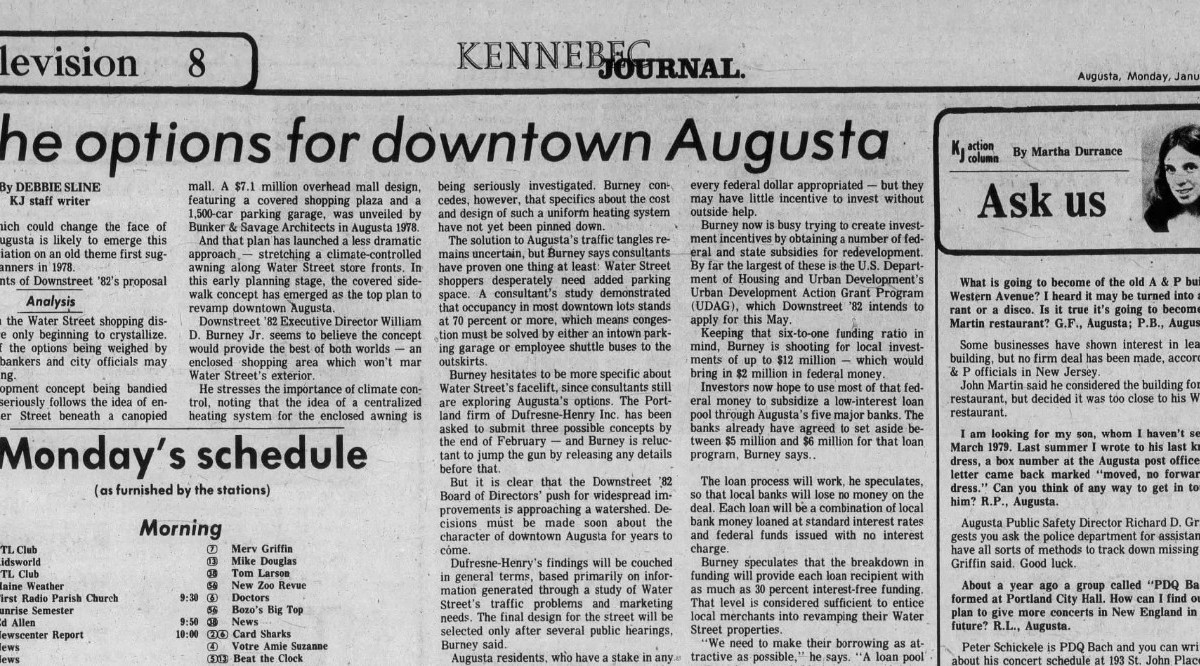 Jan. 21, 1980: Could Water St. in Augusta be transformed into a canopied shopping mall? Also, Augusta council to act on 3 variants of 7-Eleven store