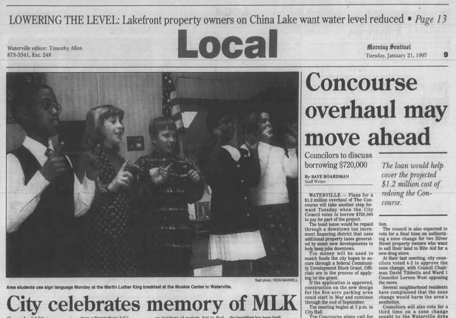 Jan. 22, 1997: $1.2M overhaul of Concourse in Waterville may move ahead tomorrow, Waterville celebrates memory of MLK Jr., and Waterville woman avoids jail time after charge of stabbing boyfriend