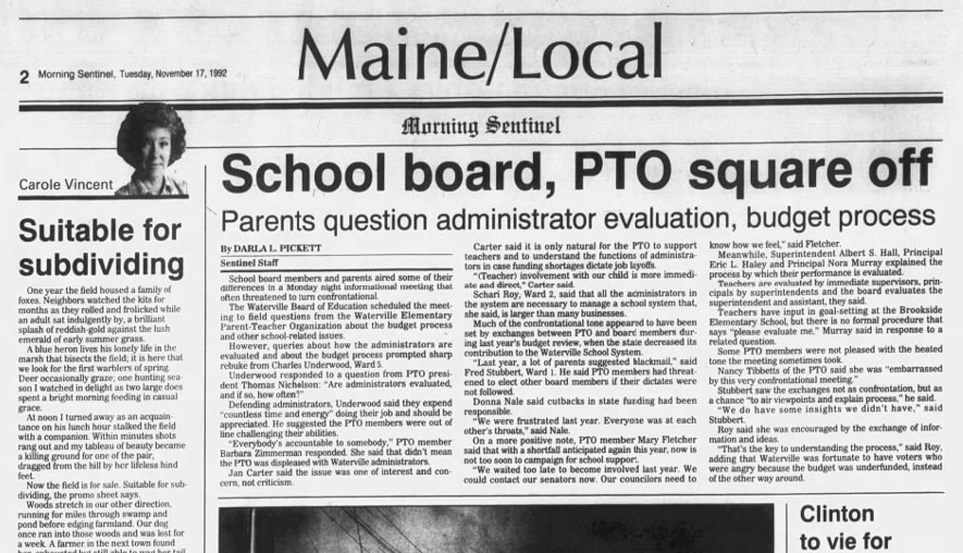 Nov. 17, 1992: Waterville school board members & PTO square off in meeting, town of Clinton goes for ‘All-American’ award, and fire destroys used furniture store in Waterville