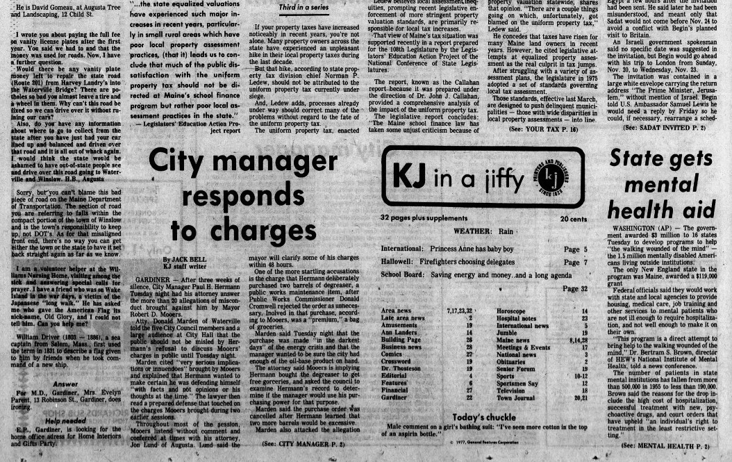 Nov. 16, 1977: Gardiner city manager responds to over 20 allegations of misconduct against him, Maine awarded $119,000 grant for mental health services, and we untangle your tax bill in a three-part series