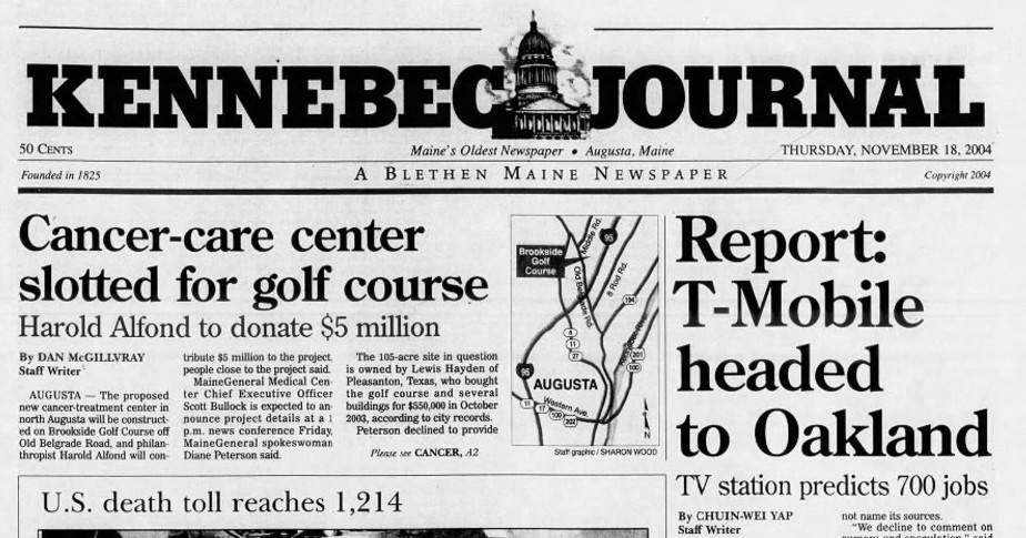Nov. 18, 2004: T-Mobile plans to open call center with 700 jobs at FirstPark in Oakland, cancer-care center slated for golf course in Augusta, and Iraq War death toll reaches 1,214