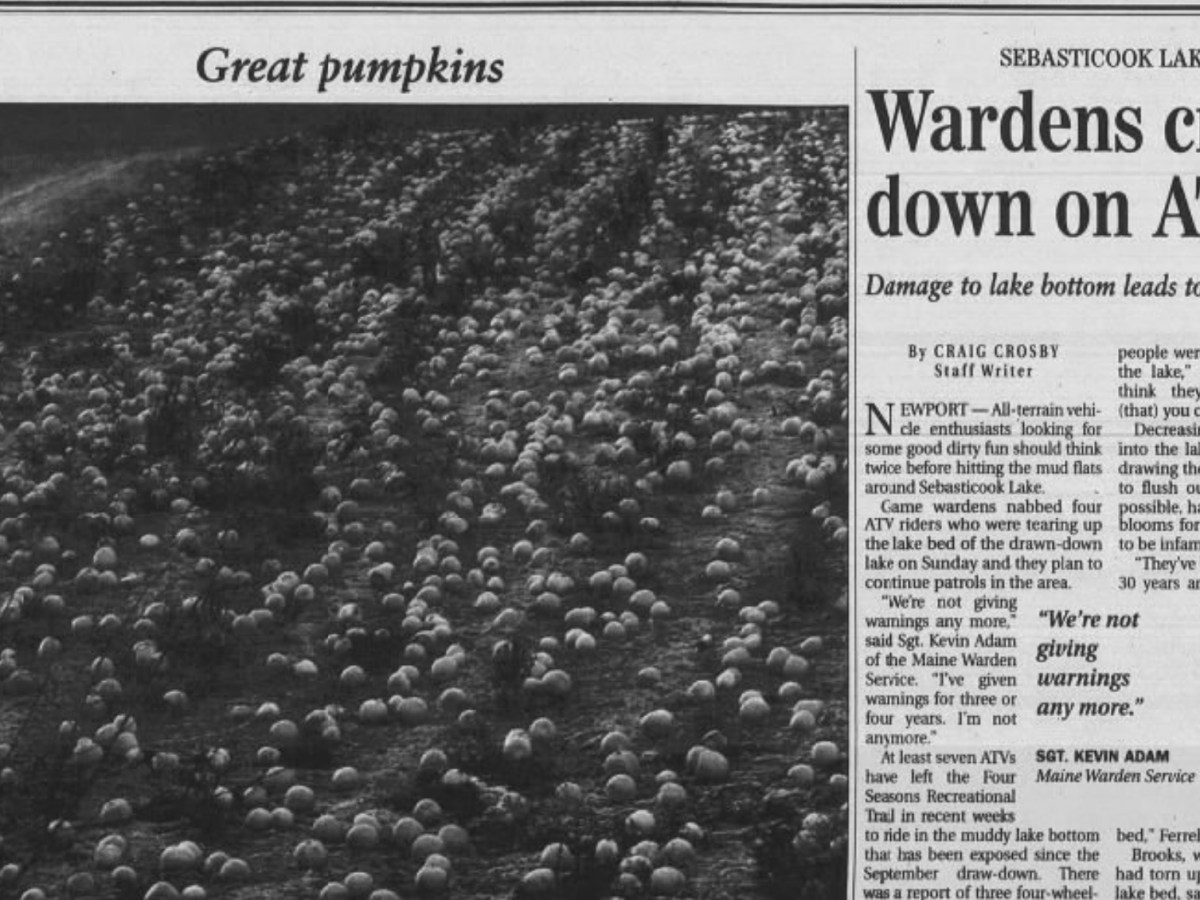 Oct. 24, 2007: Wardens cracking down on ATVs cruising around Sebasticook Lake in Newport, Turnpike Authority rejects toll study, and good gourd, check out all these pumpkins in Farmington!