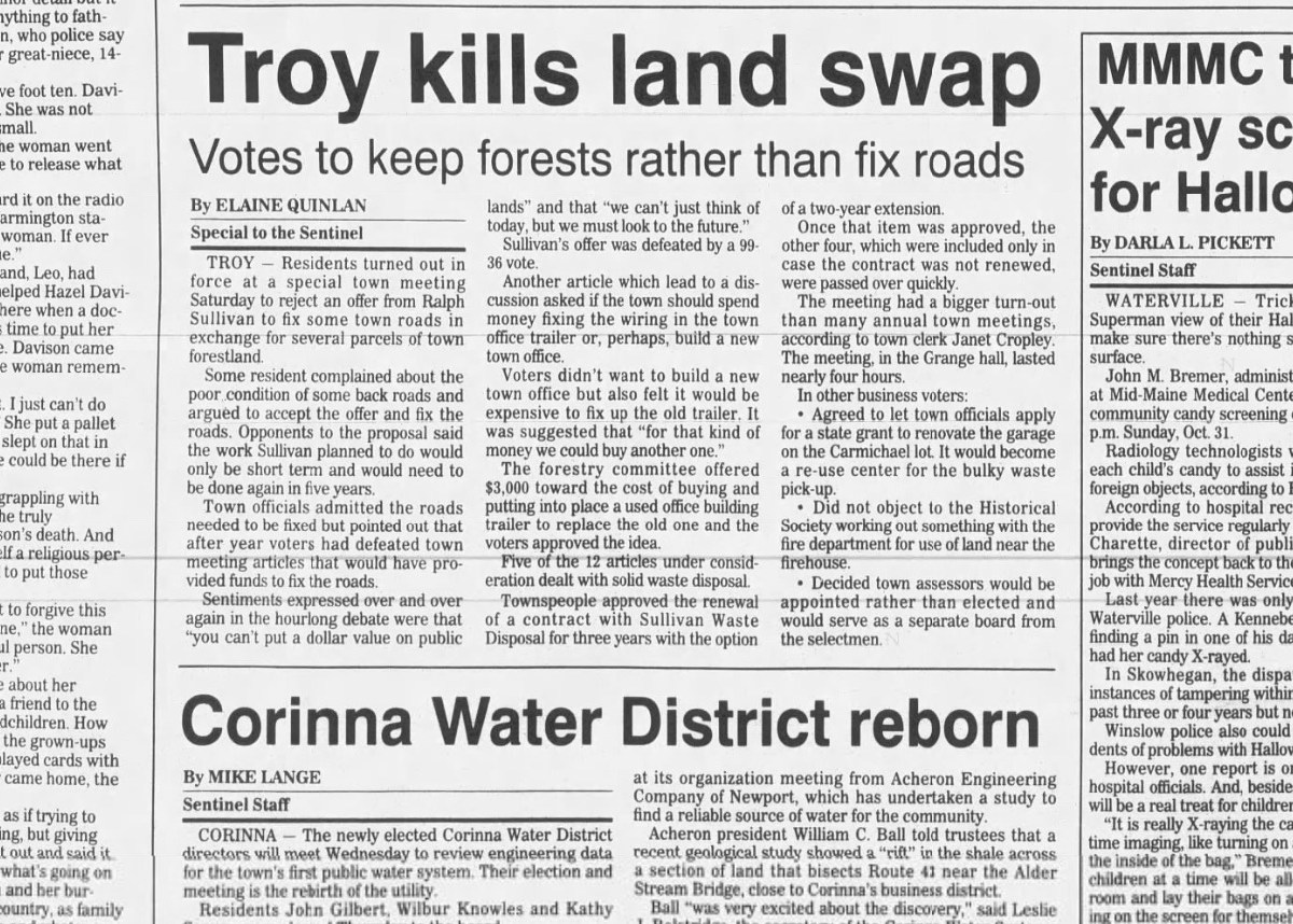 Oct. 25, 1993: Waterville hospital to offer free X-ray screening of any kid’s candy for Halloween, residents from Troy reject land swap in special town meeting, and are changes in the air in St. Albans?