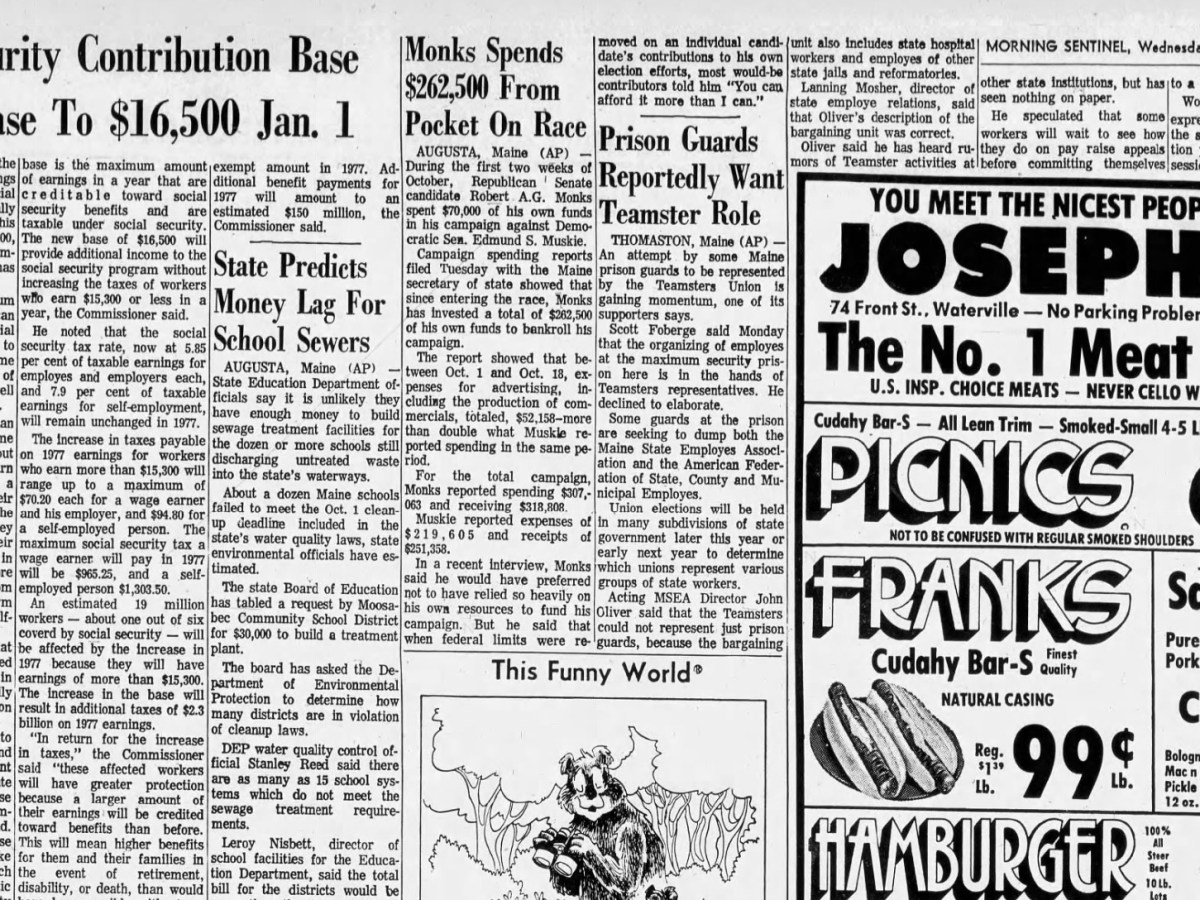Oct. 27, 1976: Social Security contribution base will increase to $16,500 next year, GOP candidate for senate spends $700,000 out of pocket on his campaign, and a sewage treatment facility for some schools in Maine will have to wait