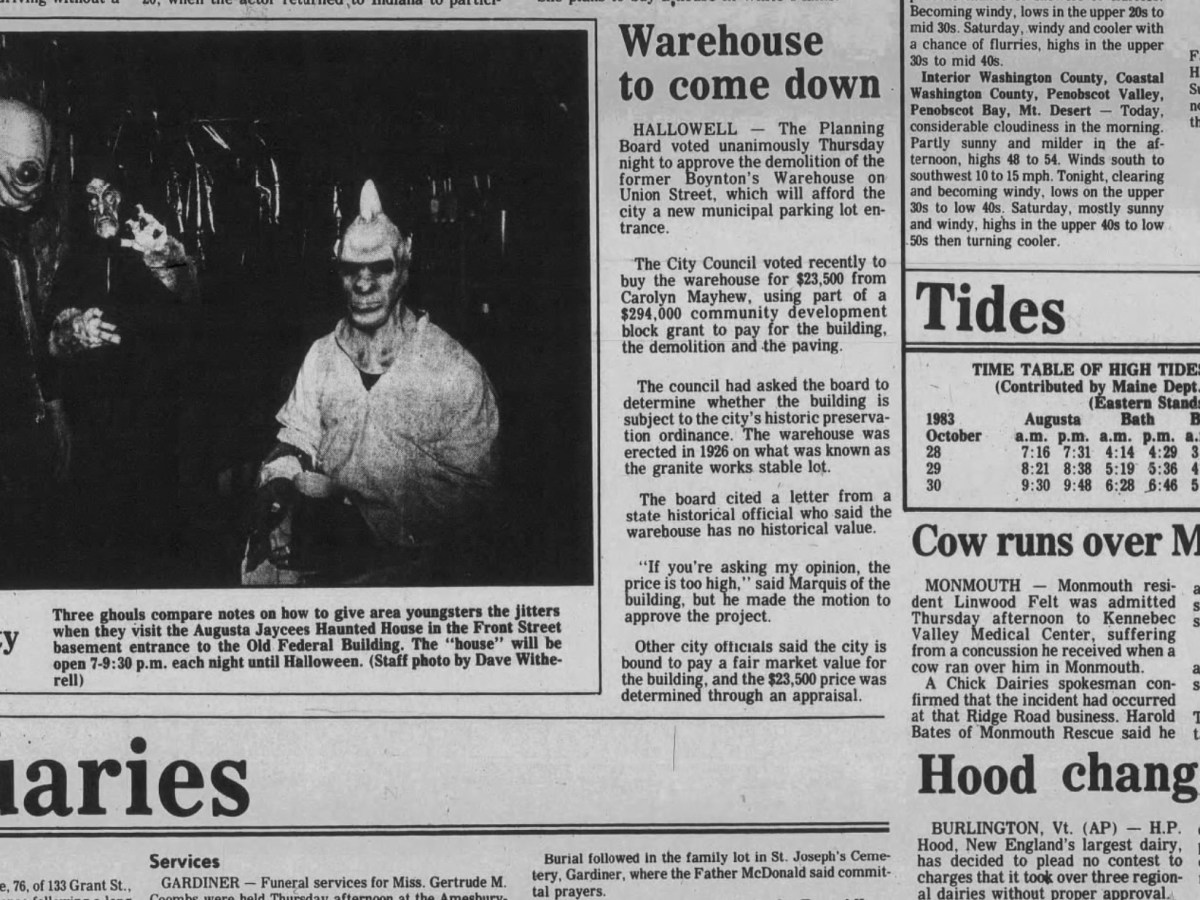 Oct. 28, 1983: Man suffers concussion after cow runs over him in Monmouth, former Boynton’s Warehouse in Hallowell to come down, and spooks aplenty at the Augusta Jaycees Haunted House
