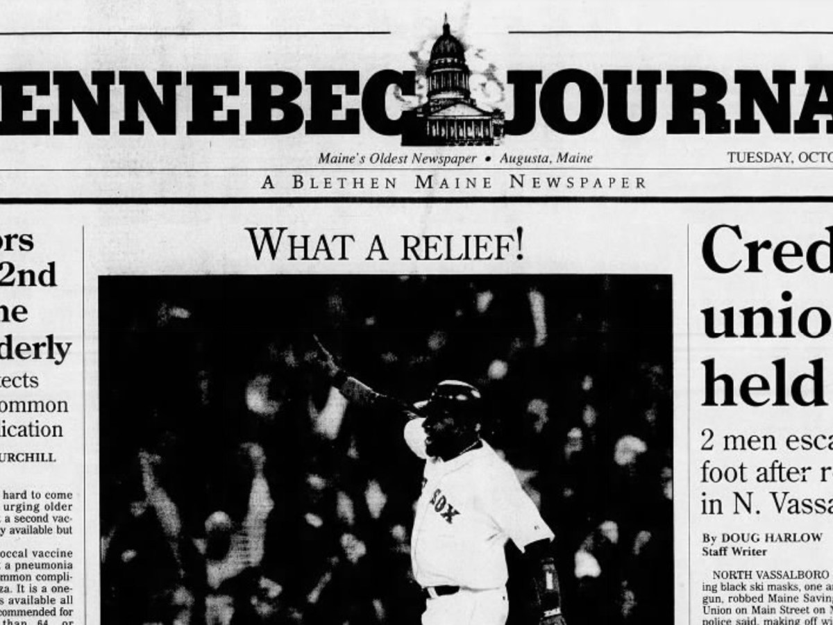 Oct. 19, 2004: Maine Savings Federal Credit Union held up by two men in North Vassalboro, doctors urge elderly to get 2nd flu shot, and Boston Red Sox’s David Ortiz comes up big for team during ALCS championship