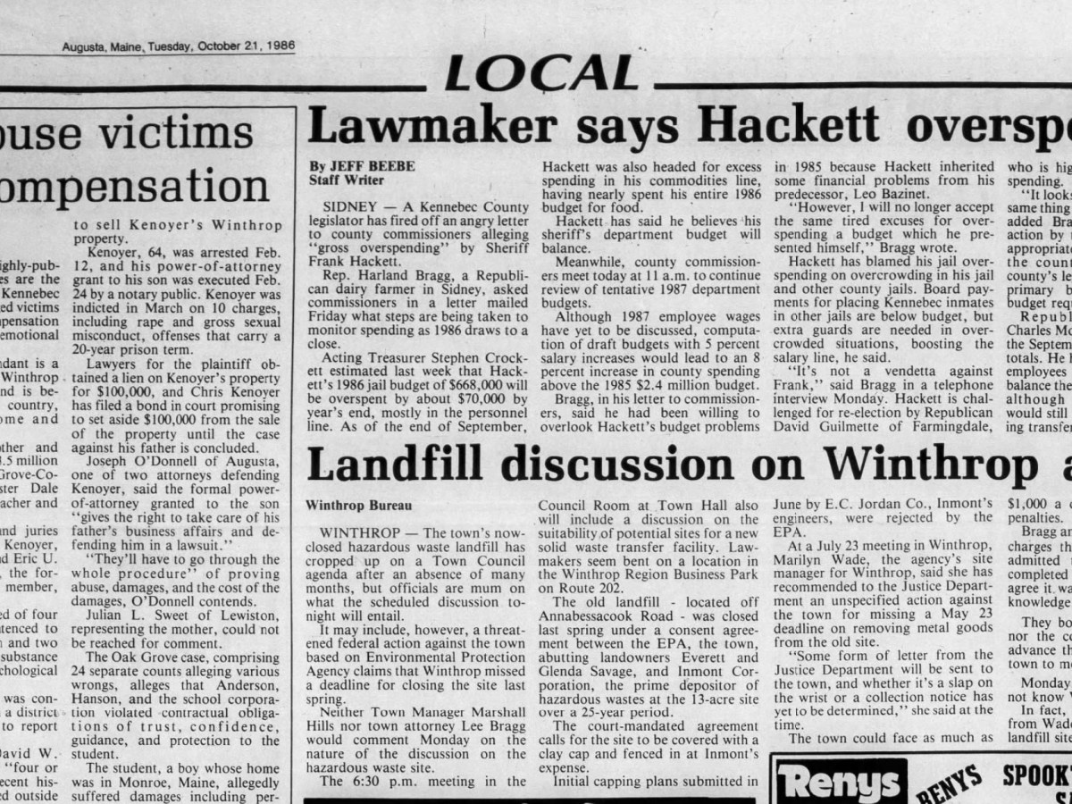 Oct. 21, 1986: Kennebec County legislator writes angry letter to county commissioners alleging ‘gross overspending’ by sheriff, sex abuse victims seek compensation, and landfill discussion on Winthrop agenda tonight