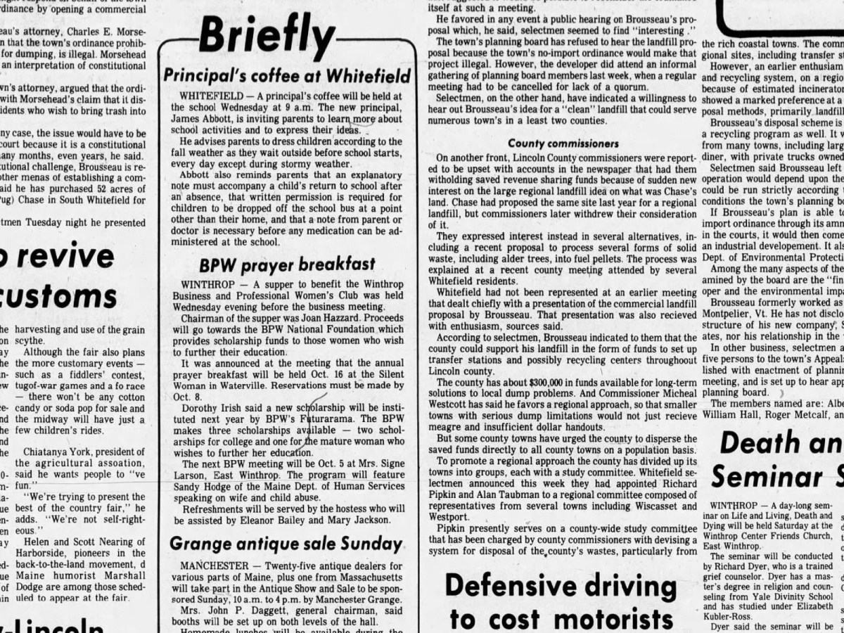 Sept. 23, 1977: 1st annual Common Ground Fair kicks off today in Litchfield, controversy erupts over sanitary landfill possibly opening in Whitefield, and antiquers will want to come to Manchester this weekend