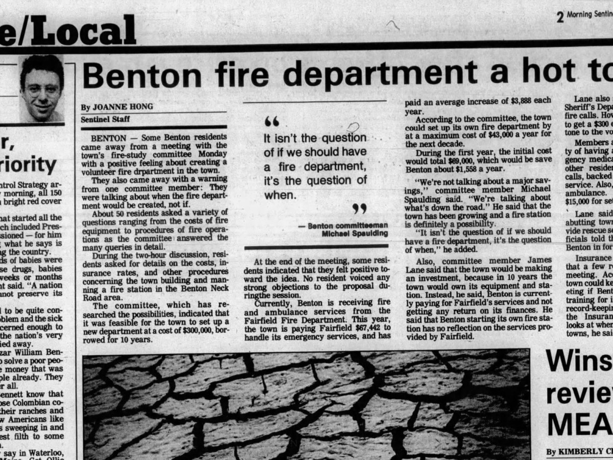 Sept. 12, 1989: A new Benton volunteer fire department a hot topic with residents, Winslow High school had decent MEA scores this year, and a psychiatrist from Farmington is fighting for his practice
