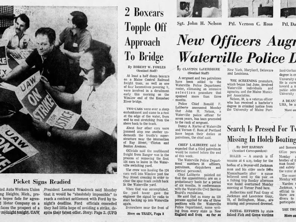 Sept. 14, 1976: At least 6 boxcars topple off freight train near Winslow end of Kennebec River bridge, sergeant and 2 patrolmen join Waterville Police Department roster, and an axe wedding?
