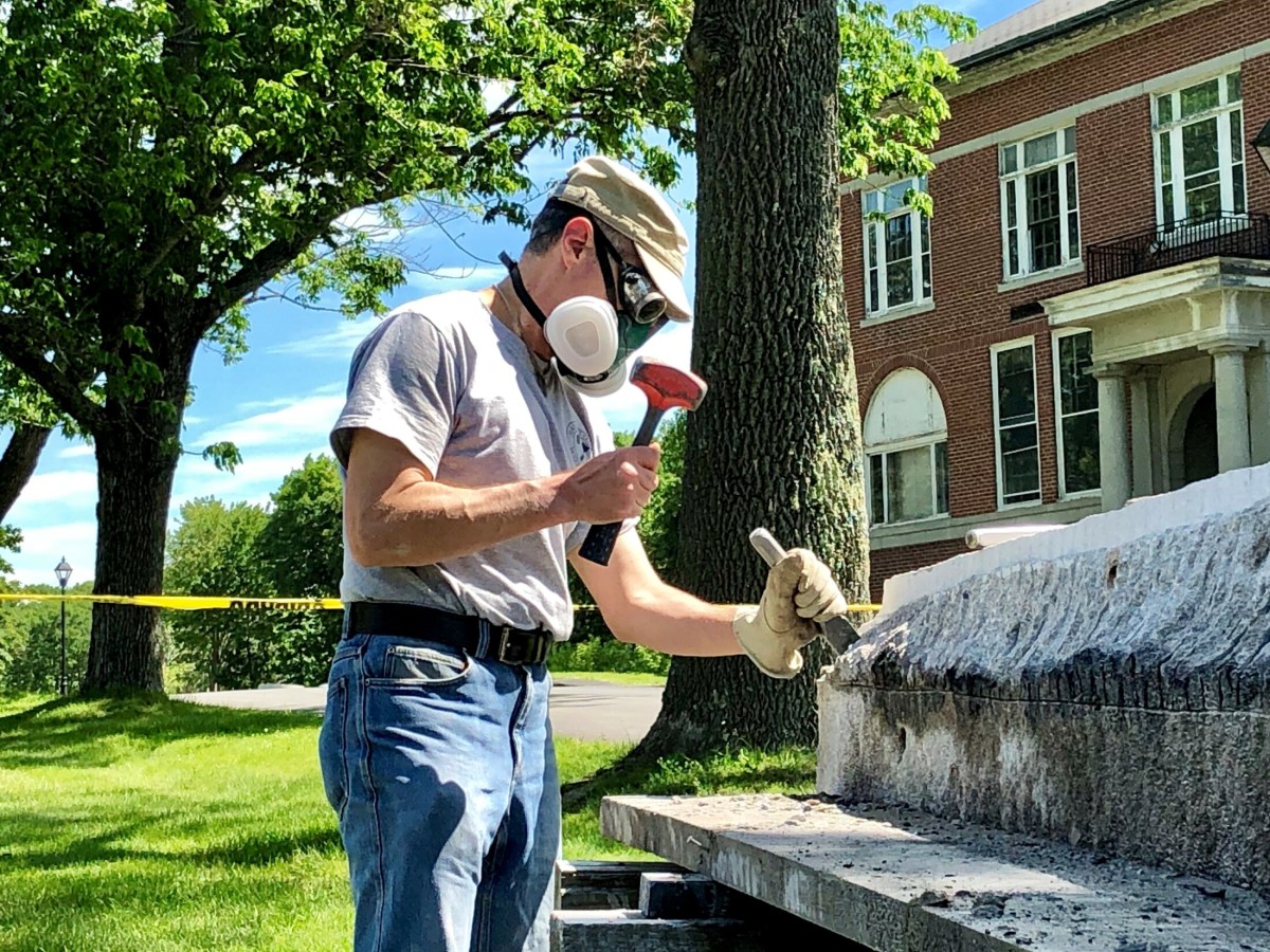Sculptor Jon Doody set up shop at Stevens Commons last month to start a summer-long project to carve a sturgeon from a one-ton block of Hallowell granite.