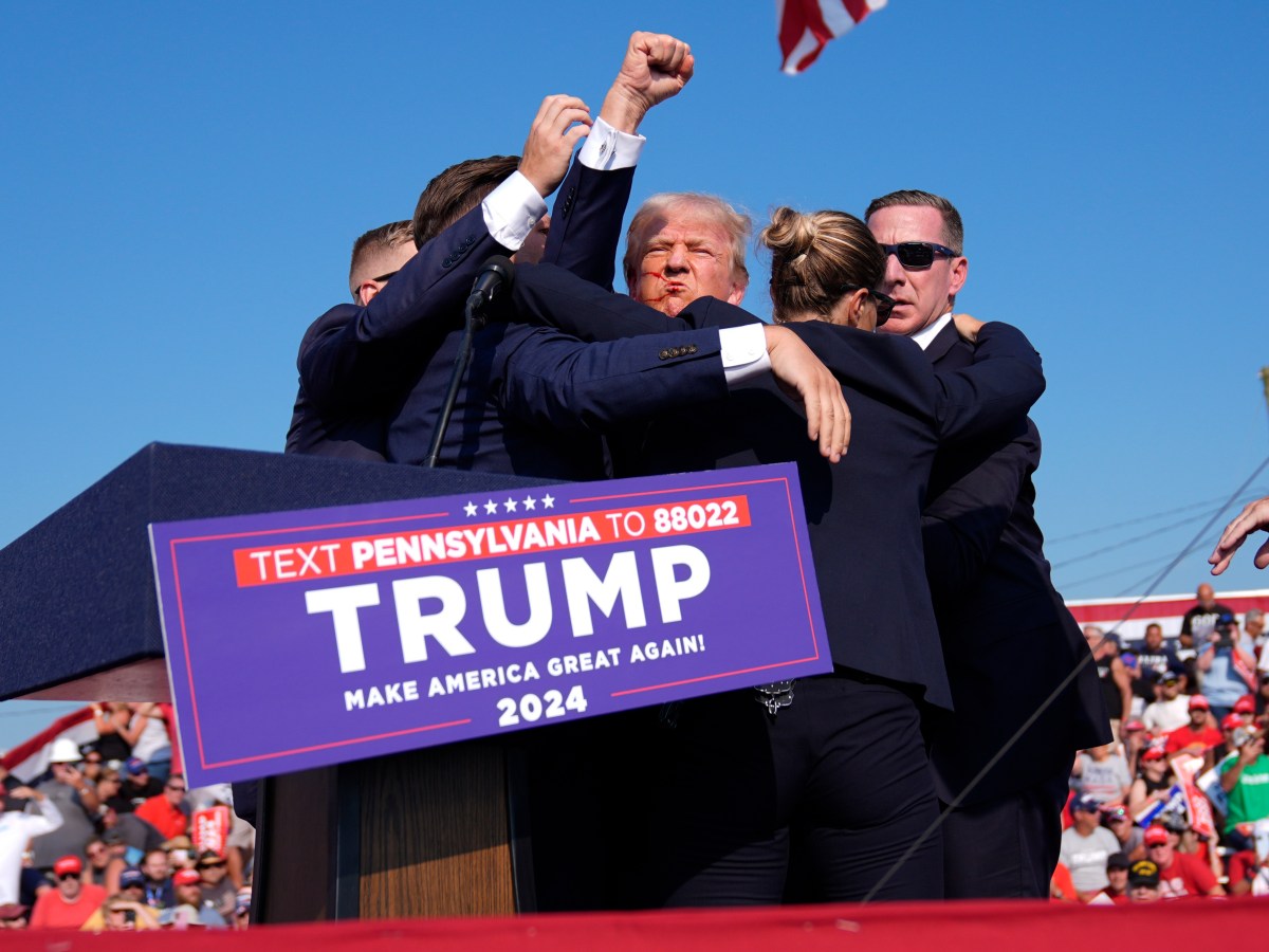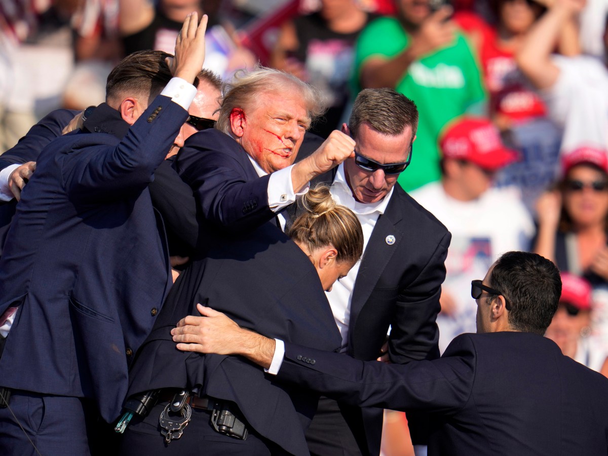 Trump, his face smeared with blood, forced his right fist through a tangle of agents’ arms. He raised it high into the air before pumping his fist.