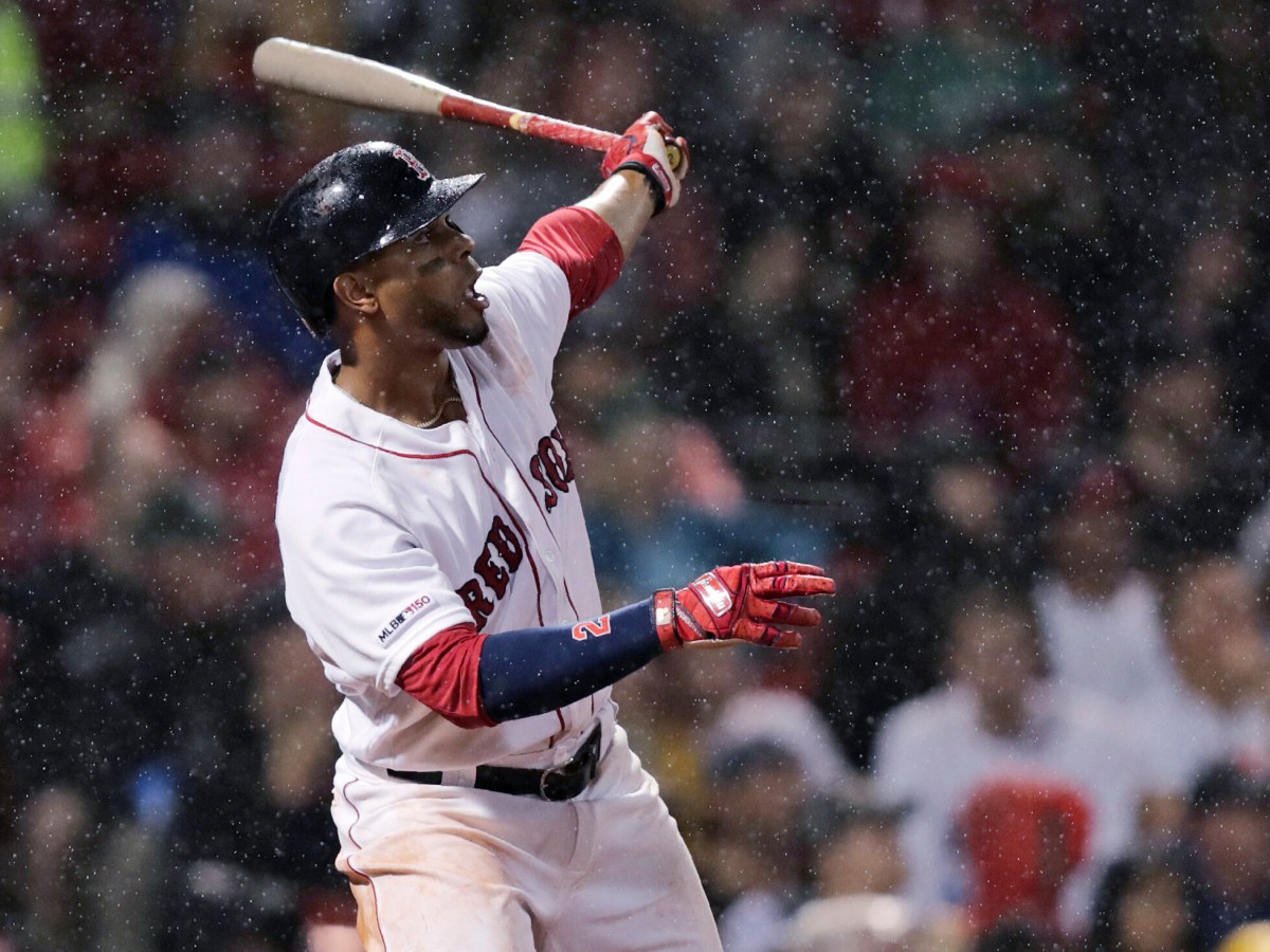 Xander Bogaerts breaks a 3-3 tie with a two-run homer in the fifth inning on a wet night at Fenway Park.