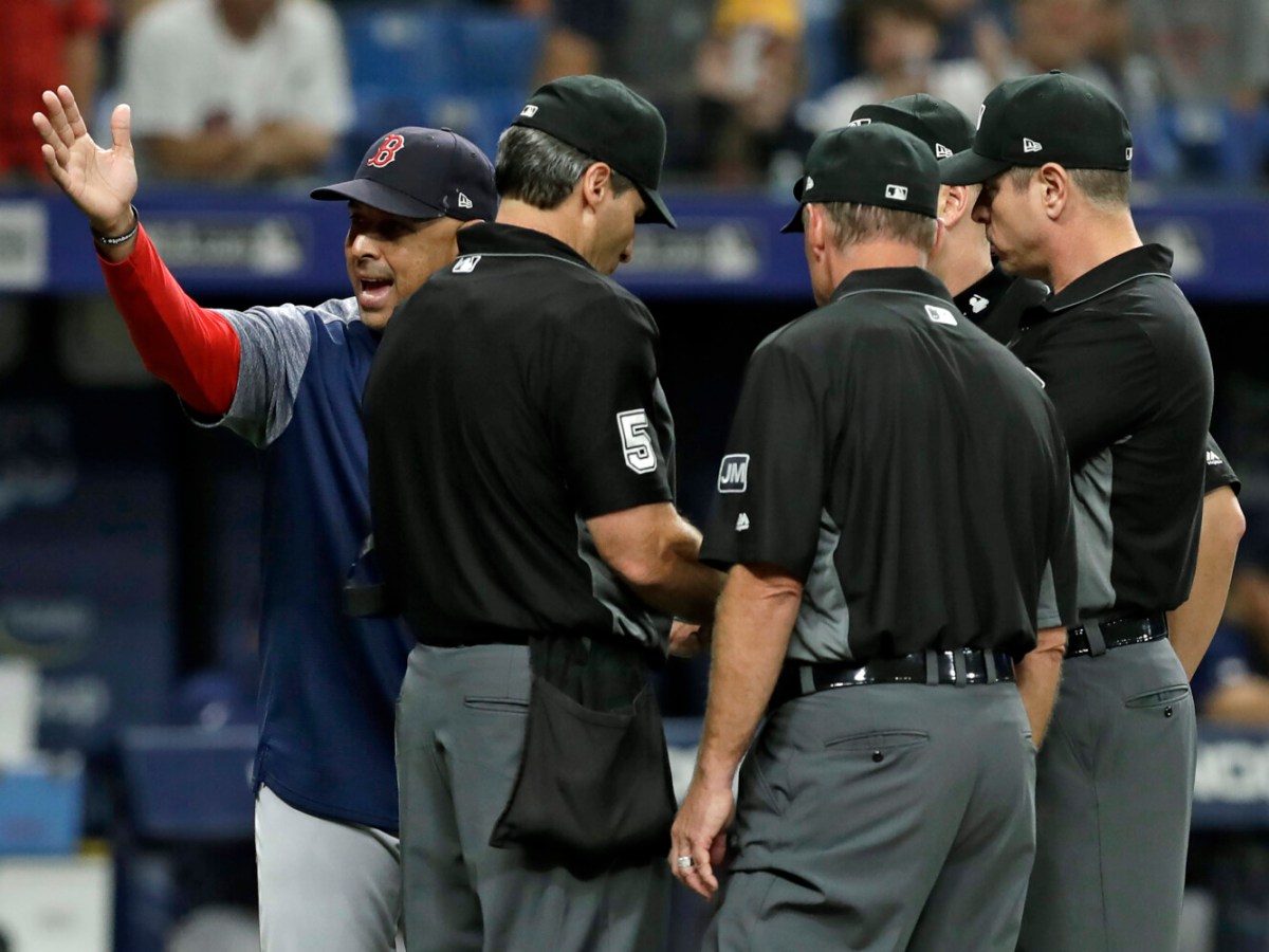 Charlie Morton strikes out 11 to get the win, but in the eighth inning a series of defensive changes – including moving a pitcher to first base, then back to the mound – prompts Boston Manager Alex Cora to protest the game.