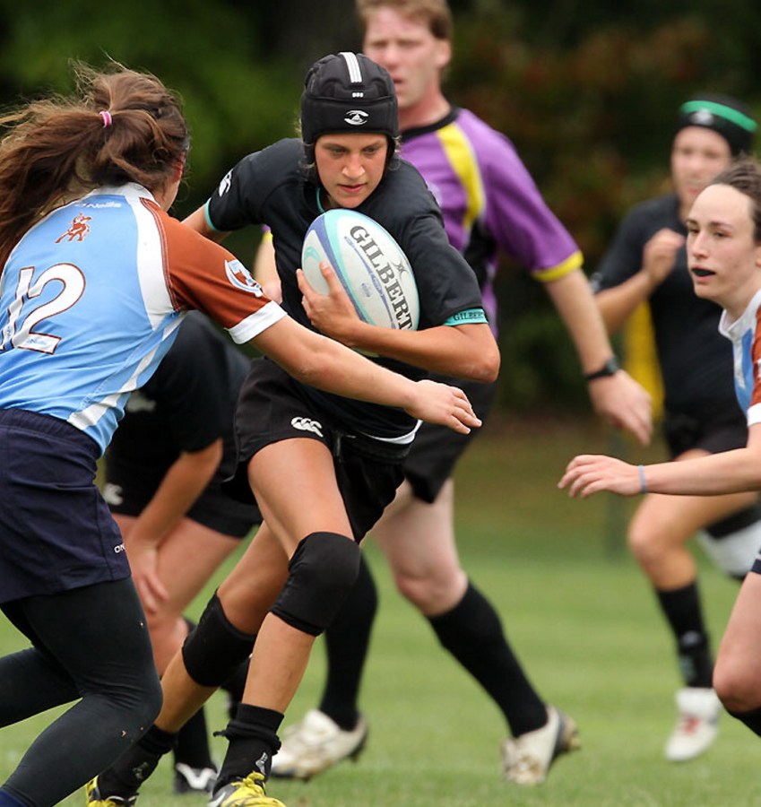 Hayleigh Kein, Anna Piotti and Georgia Bolduc are playing rugby for Bowdoin College.