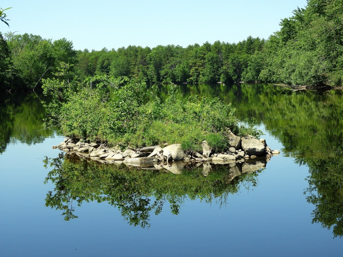 The Kennebec River in this area is clear and refreshing, with a bounty of islands lush with trees.