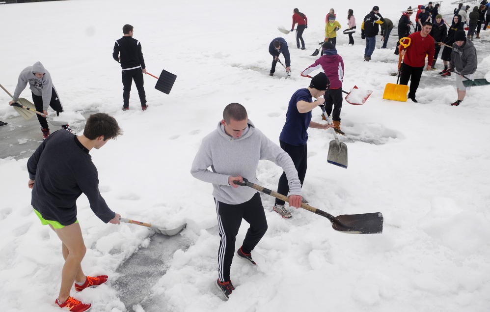 Most teams kicked off their seasons indoors Monday, except the Hall-Dale team which had to shovel snow off its outdoor track.
