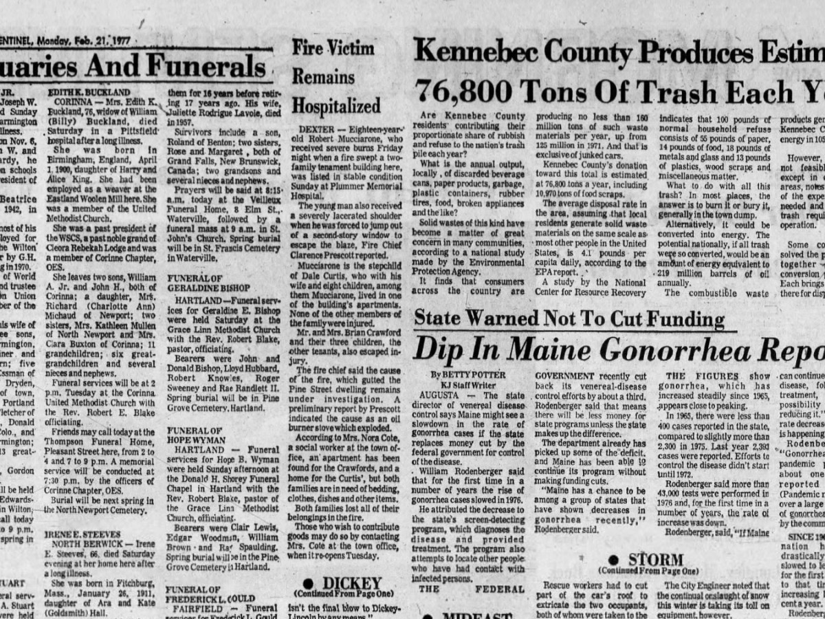 Feb. 21, 1977: Kennebec County produces estimated 76,800 tons of trash each year says study, gonorrhea cases dip in Maine, and Dexter fire victim remains hospitalized after fire swept through a two-family tenant building