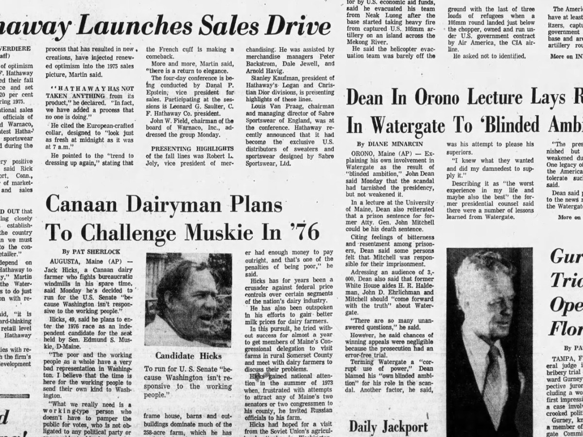 Feb. 25, 1975: Canaan dairyman plans to challenge Edmund Muskie for Senate in 1976, C.F. Hathaway Co. in Waterville launches sales drive, and lecturer at UMaine in Orono talks about his role in ‘Watergate’