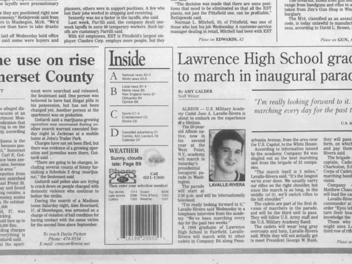 Jan. 18, 2001: Cocaine use on the rise in Somerset County with recent drug busts in Skowhegan, Jackman, and Madison, tech company lays off 17 in Pittsfield, and Lawrence High School graduate to march in inaugural parade in Washington D.C.