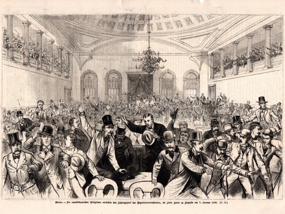 Civil War hero Joshua Chamberlain came to the rescue, risking his own safety to keep peace as armed Republicans surrounded the State House claiming the 1879 gubernatorial election had been stolen.